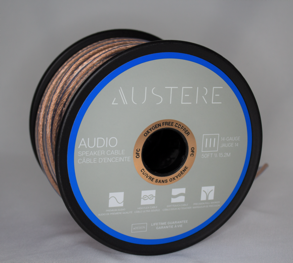 Austere Speaker Cables are built for durability and designed to deliver flawless sound from source to speaker. Featuring fine-stranded ultra-pure copper thats been bundled to accurately transfer the full range of audio frequencies to your speaker for a lifelike sound. And with highs^ mids and lows transferring at the same rate^ your music^ media and games have never sounded more pristine. For smooth wire routing along baseboards and around corners^ Austere Speaker Cable is wrapped with our signature SoftTouch^ high-flex durable jacket. To further ensure our cables perform every time^ we also added our unique precision pull marker to limit stress on the cable. Combined with Austere Banana Adapters^ the result is a solution that's technologically superior and visually stunning. More Than Expected. Always.