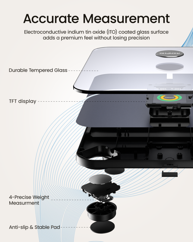 When you step on the high-precision sensors^ a tiny electrical current is sent from the scale up through the bottom of your feet and into your body. The resistance of this current as it travels through the various layers of your body^ combined with an advanced algorithm^ is what enables the calculation of the 13 body composition indexes you can access on the RENPHO Health App.