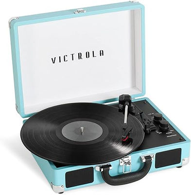 The Victrola Journey+ Bluetooth Suitcase Record Player is a classic^ loaded with features that will help you make lasting music memories. The 3-speed turntable allows you to listen to all your favorite vinyl records with excellent clarity^ and Vinyl Stream technology means you can stream albums out to any external Bluetooth speaker. Stream music from your smart device though the built-in speakers^ or plug in your favorite pair of headphones for private listening. The easy-carry handle and portable design make it easy to move the Journey+ throughout your home.